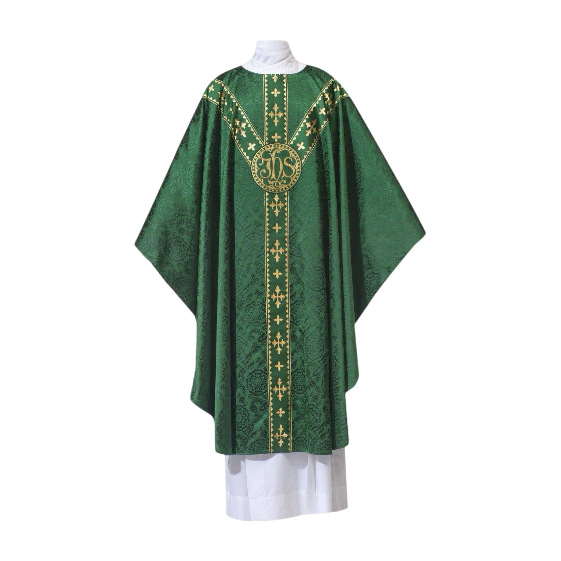 The chasubles have an ample gothic cut with a 61 inch width and a 53 inch length and include an inner stole.