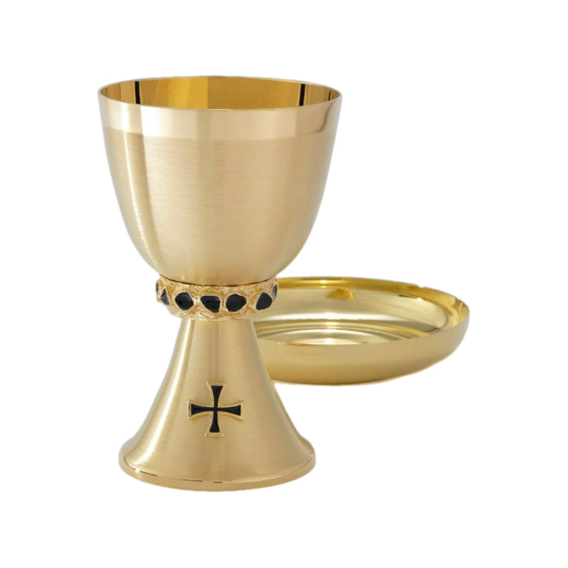 The 113G Chalice has a Satin 24K Gold Plated Finish. This Chalice comes complete with a 6 – 1/8″ Bowl Paten. The inside of the Cup has a 24K High Polished Gold Finish. The Chalice stands 6 – 7/8″ tall and the cup has a capacity of 16oz.