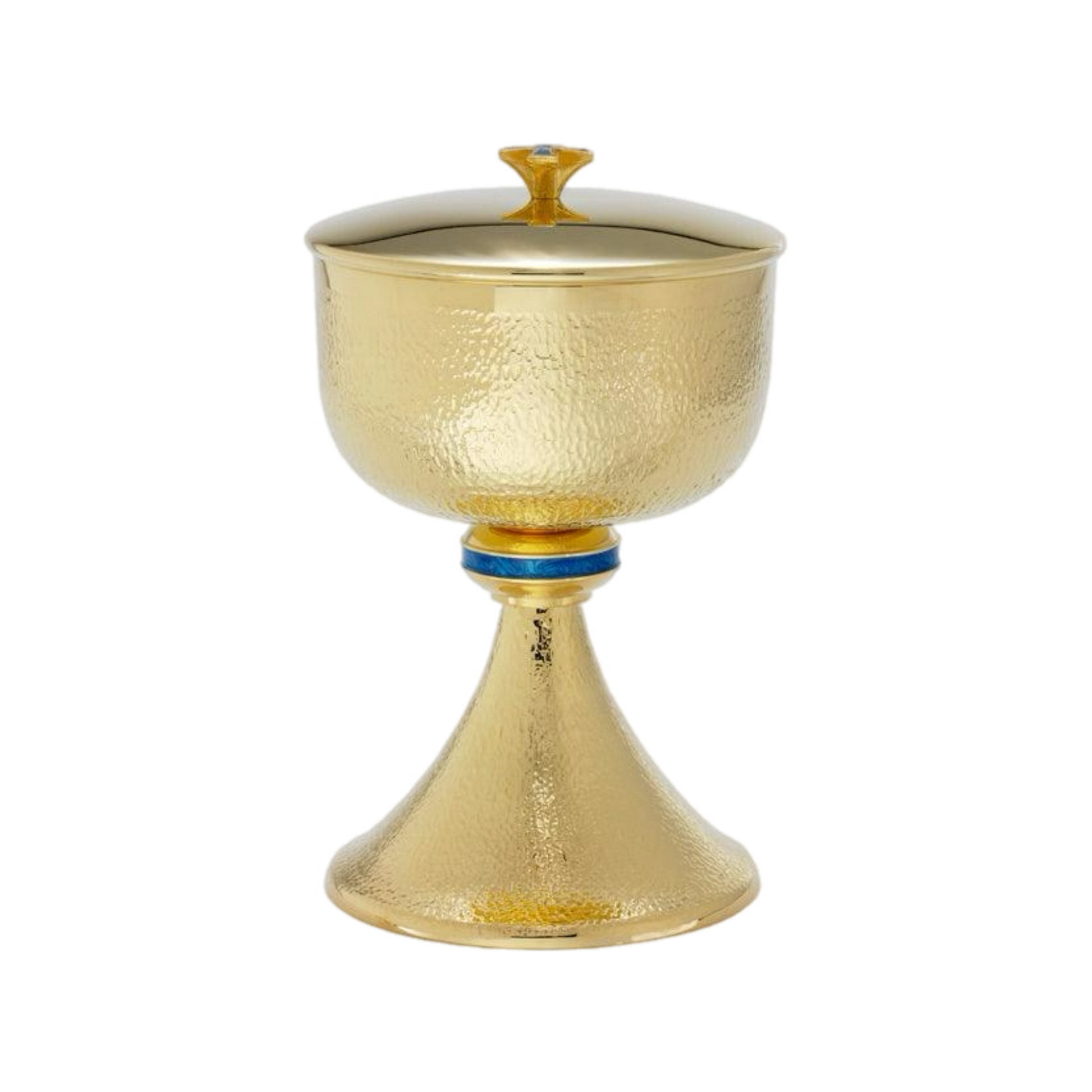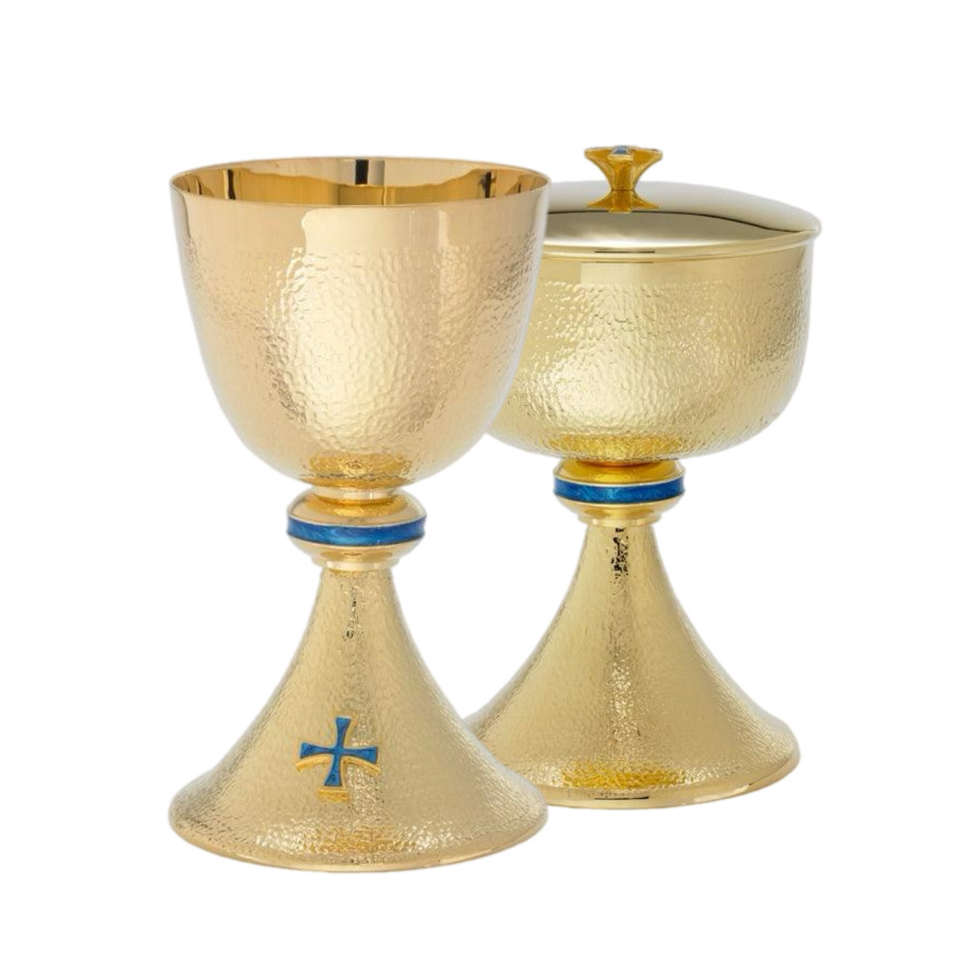 Beautifully crafted Chalice plated in 24K gold with Basket Weave Texture and Blue Lapis band on node and cross.