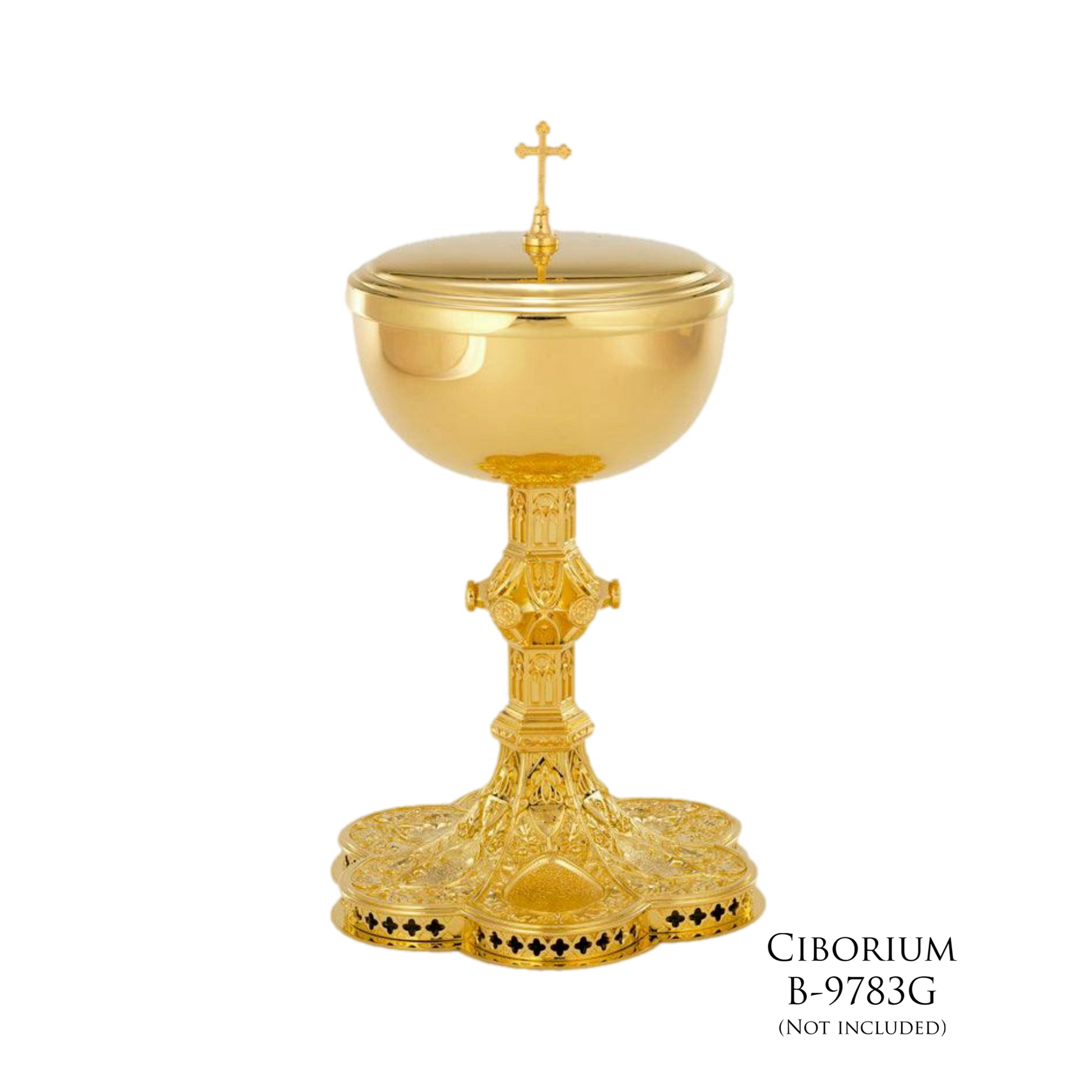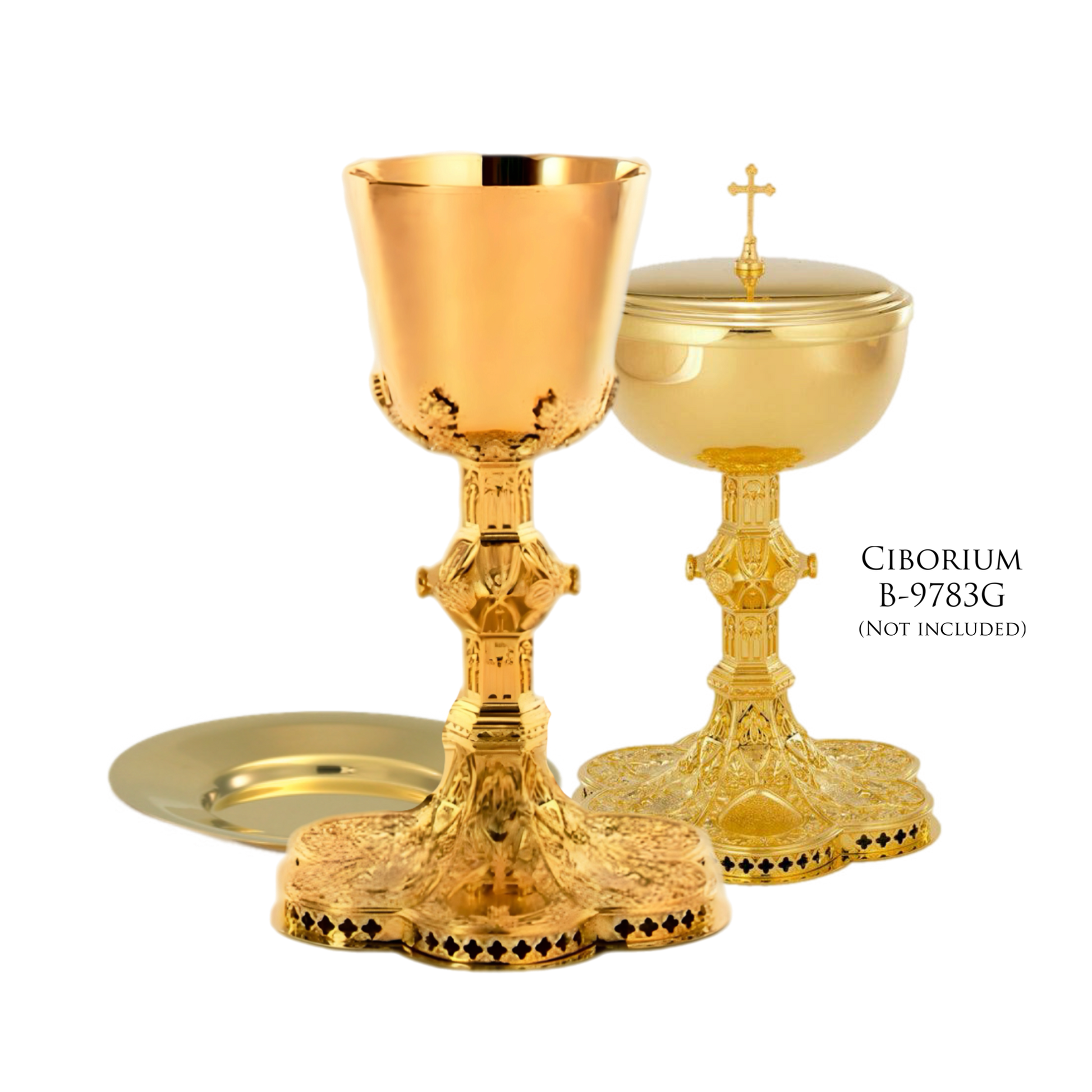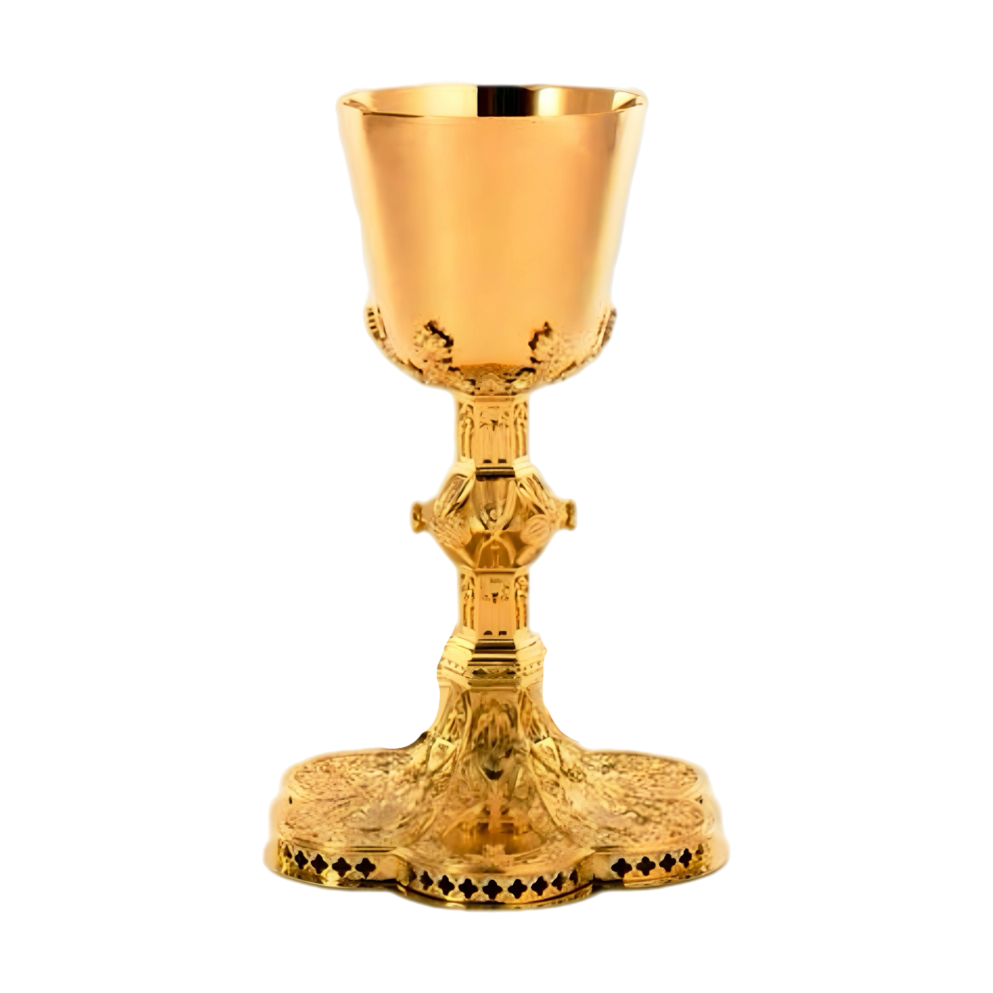 A Chalice made with a 24k Gold Plated High Polish Finish, complete with 5-3/8″ Well Paten. The inside of the Cup is finished with a High Polished Gold Plating. This Chalice stands 9-1/8″ tall with a capacity of 11 oz.
