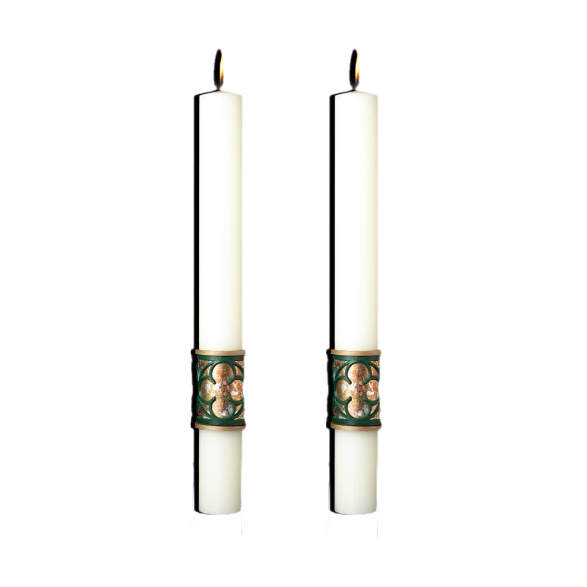 The EXIMIOUS, CHRISTUS REX Paschal Candle celebrates the Kingship of Christ as King of all humankind, King eternal, King of all Kings, King of the ages and Lord of all creation. Featuring the triumphant Christ as the centerpiece of a gothic rose window, artisans carefully apply all-natural, fine metal leafing to recreate the brillant, illuminated look of traditional stained glass. The Christ the King design is further enunciated by the presence of both the intertwined Alpha Omega and the agnus Dei framed within classic quatrefoil designs.