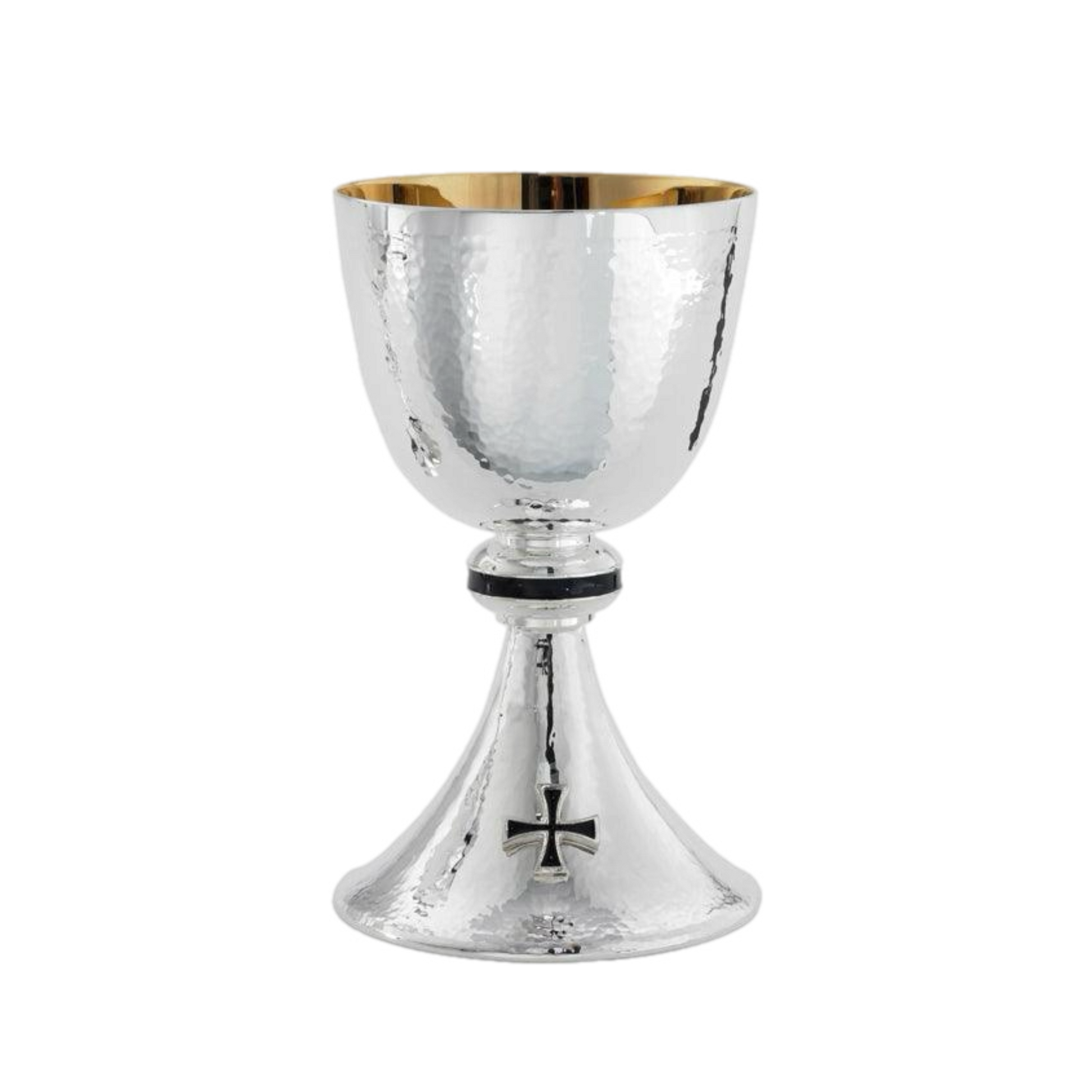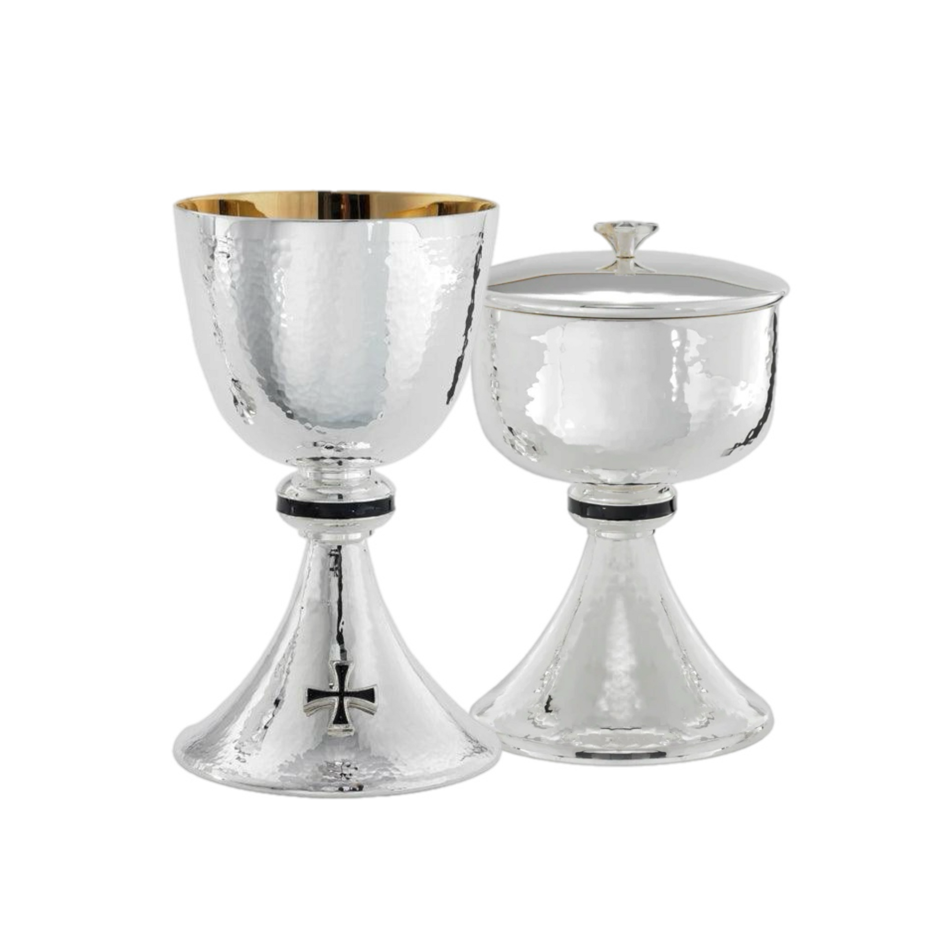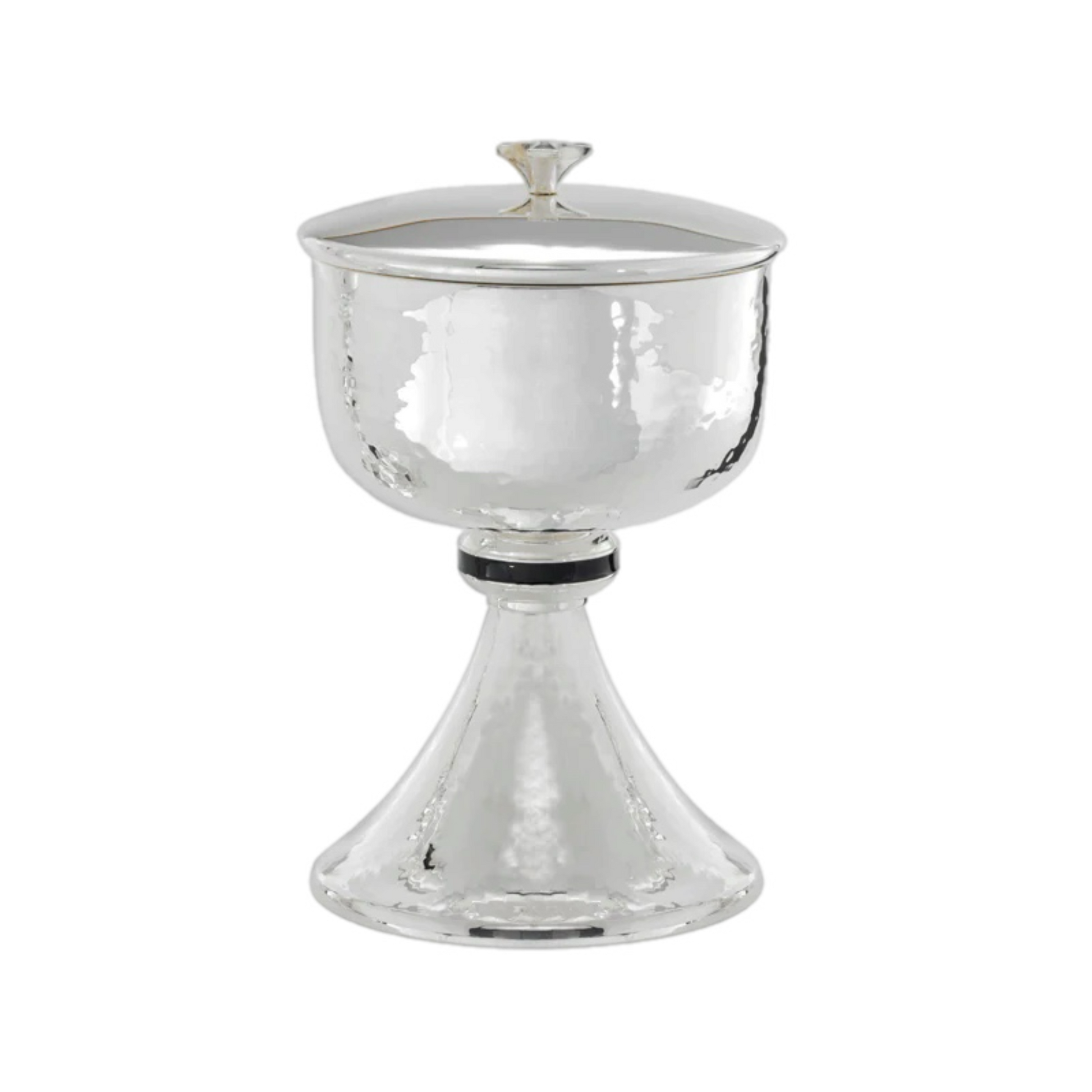 The 2083S Ciborium has a High Polished Hammered Silver Plated Finish. The inside of the Cup has a 24K High Polished Gold Finish. The Ciborium stands 7 3/4″ tall and has the capacity to hold 225, 1 3/8″ Hosts.