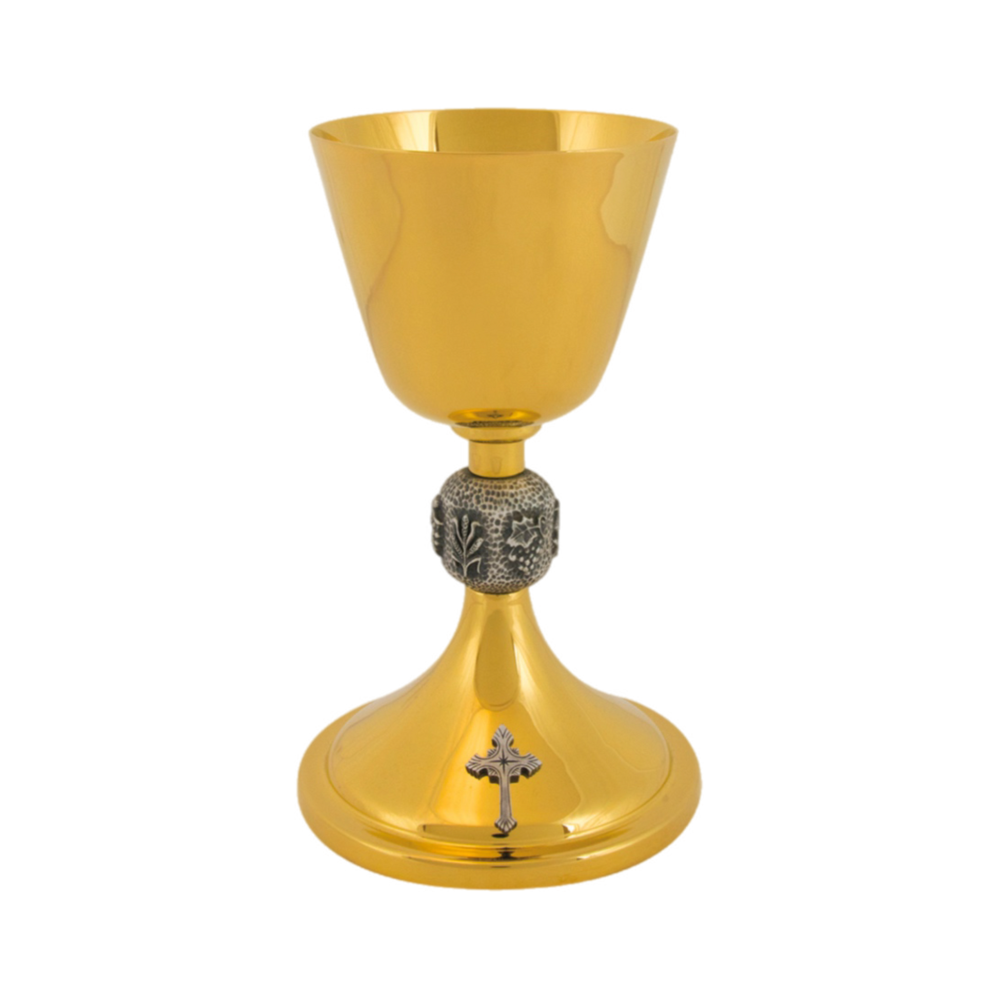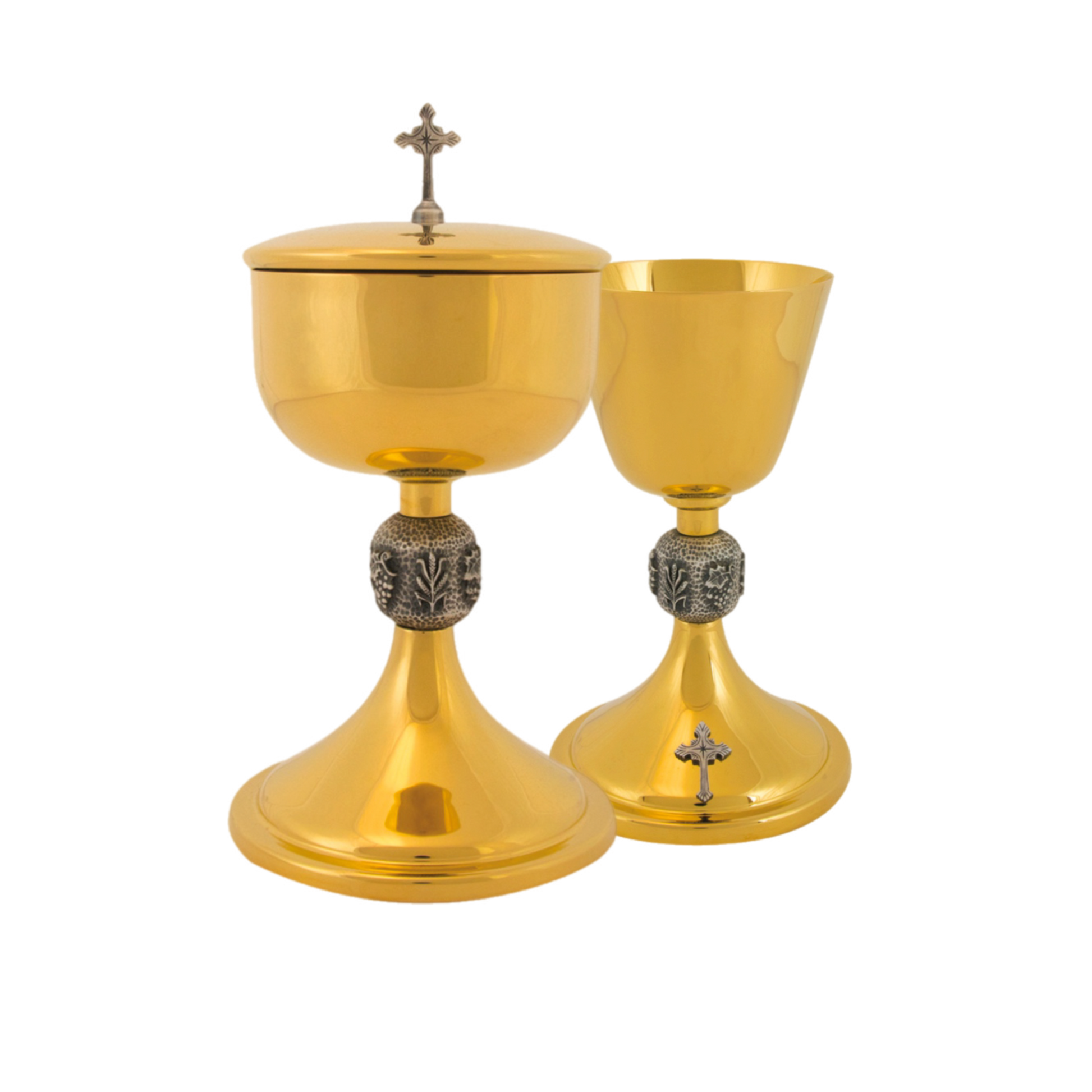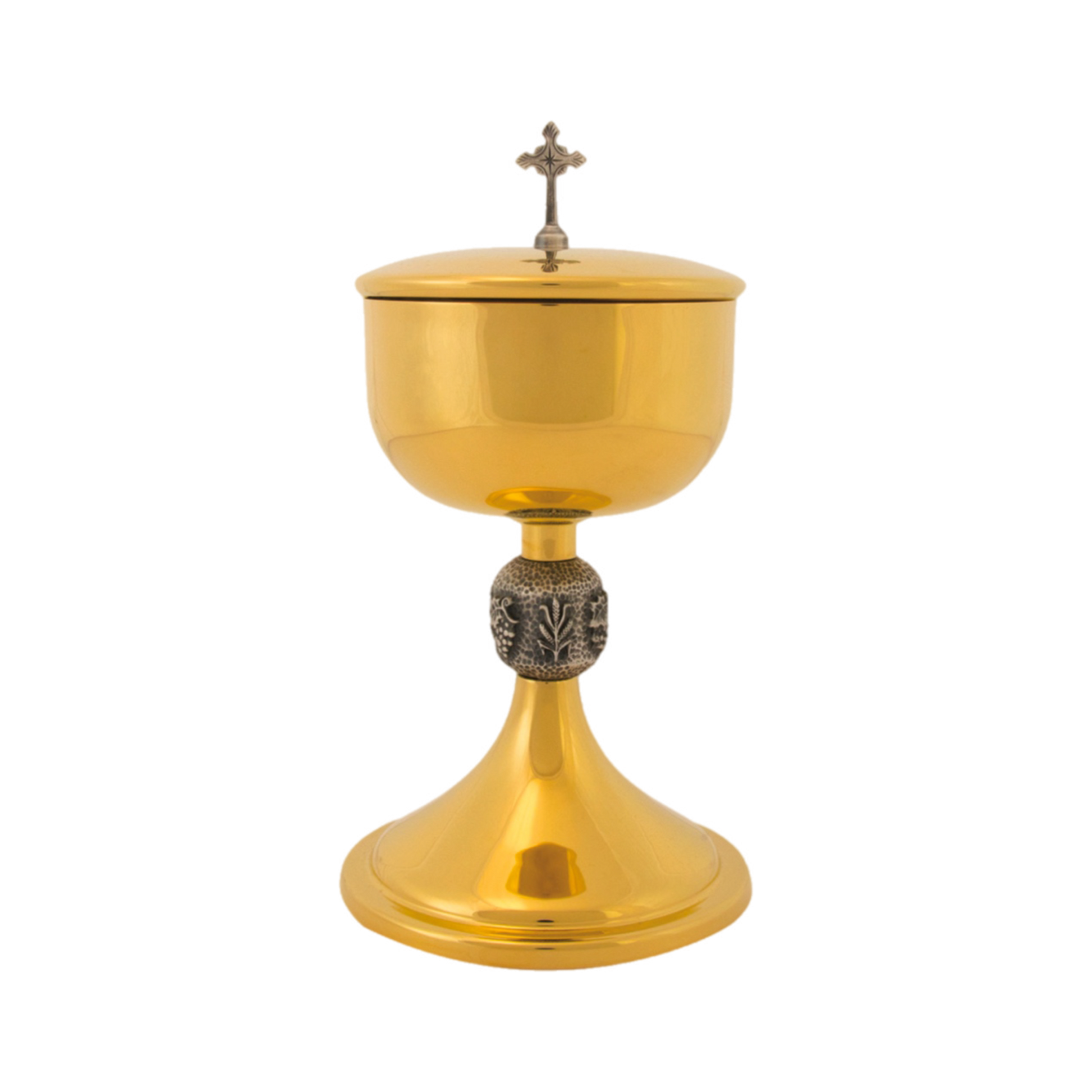 Beautiful 24K gold plated Ciborium with silver-ox Wheat Node and Cross accent.