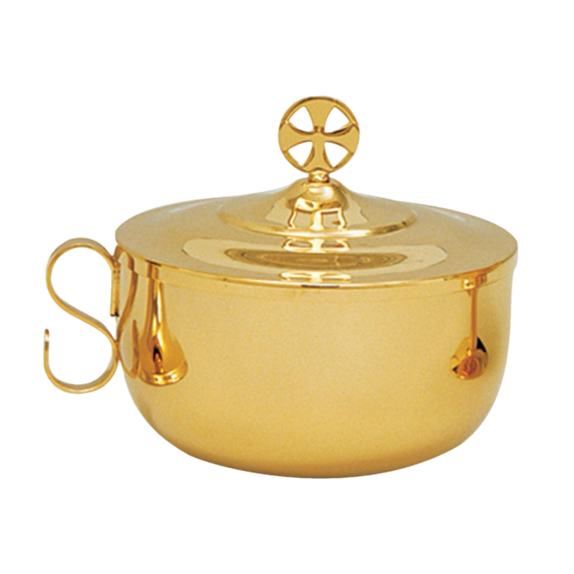 This Ciborium is Gold Plated, with a polished finish base. High Polish Gold Lined and comes with a cover.