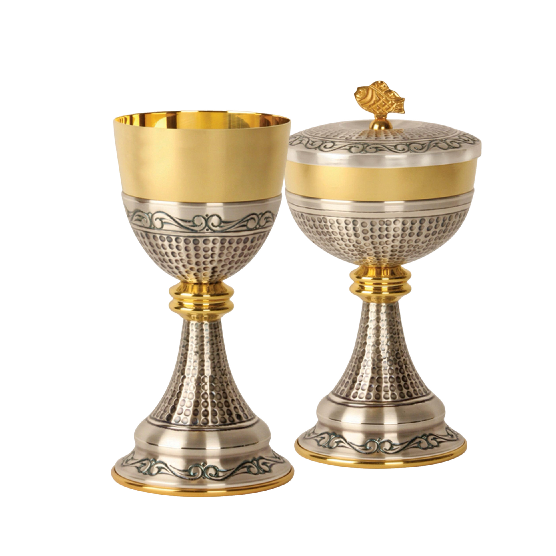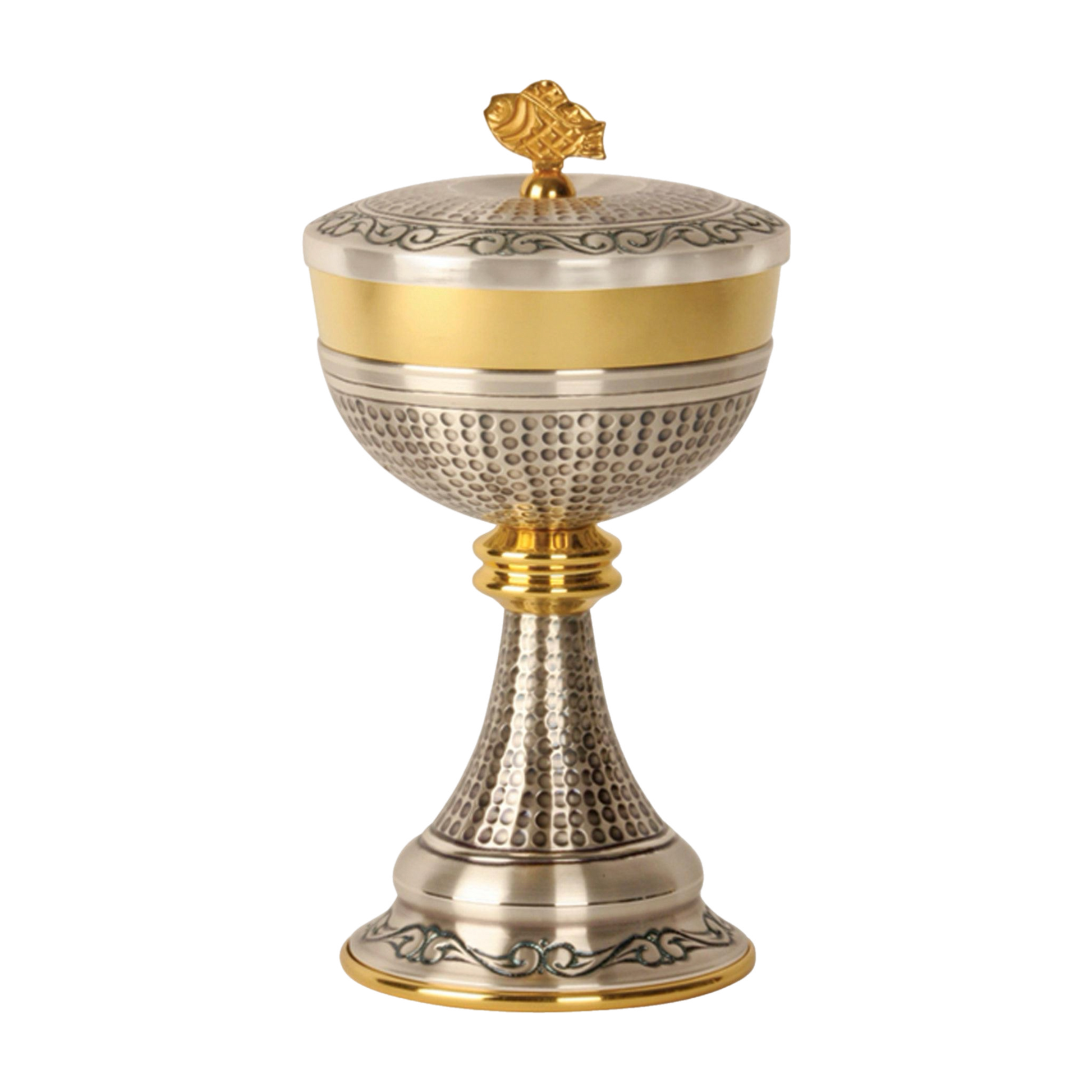 This Ciborium is made in a 24kt. Gold Plated and Oxidized Silver finish.