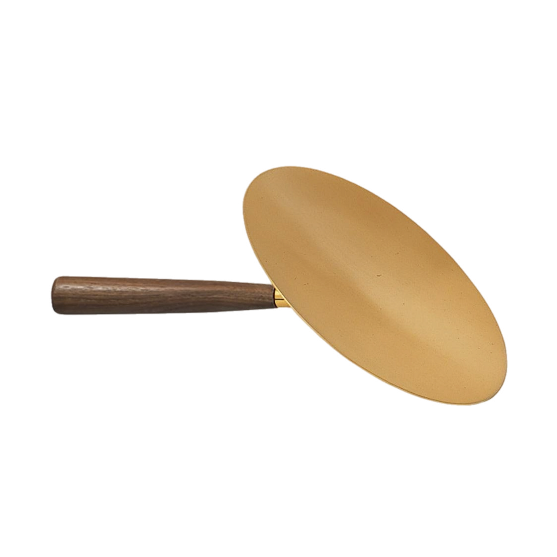 7" Diameter Gold Plated finish. This Paten has a offset round walnut handle.