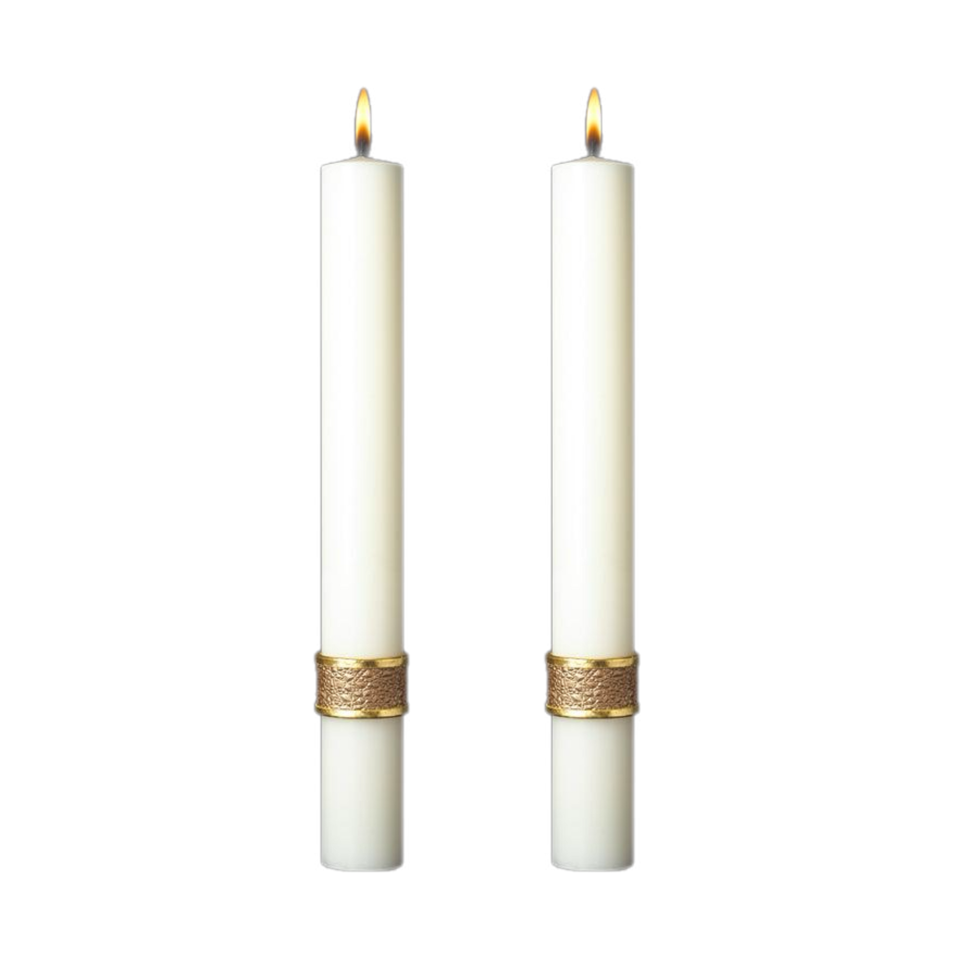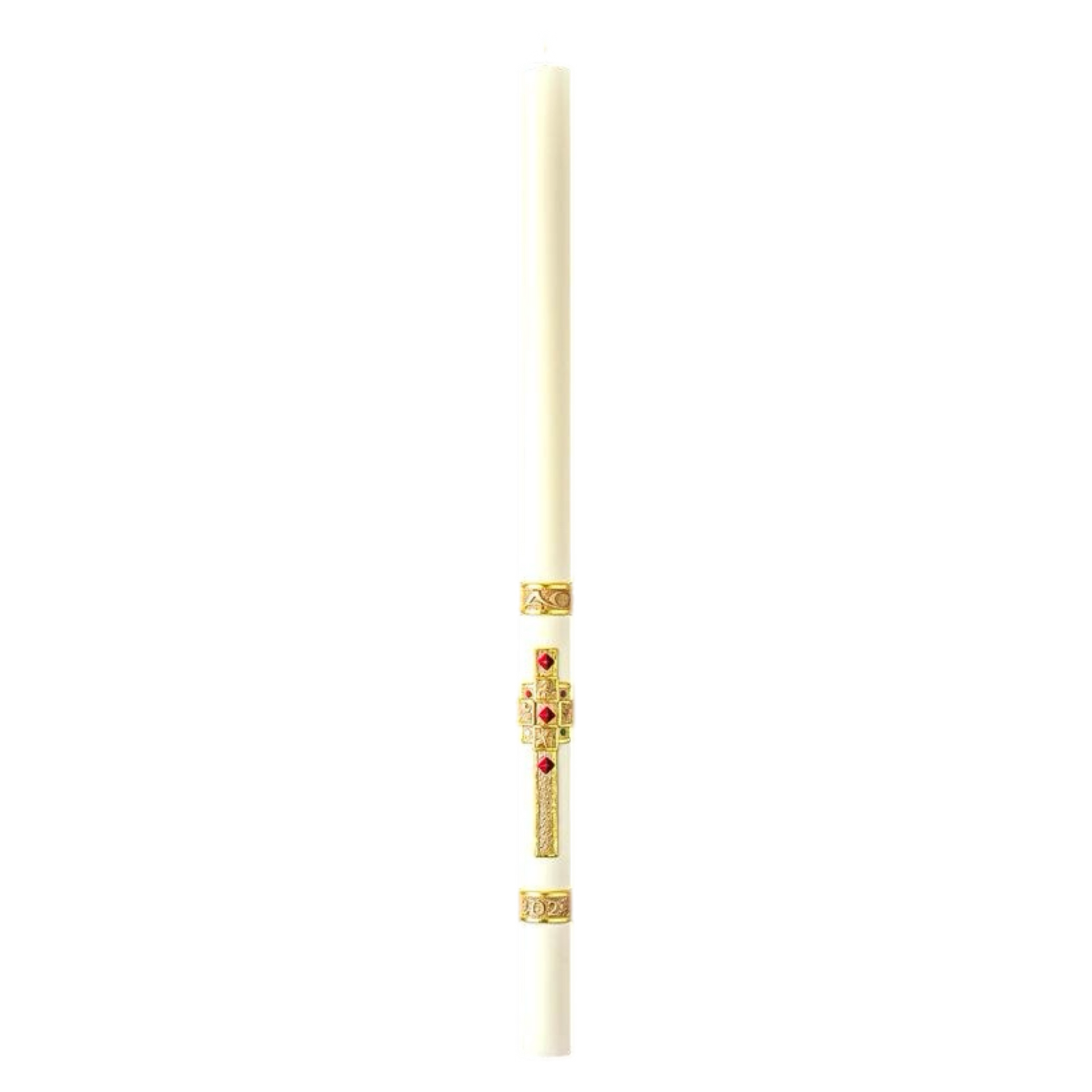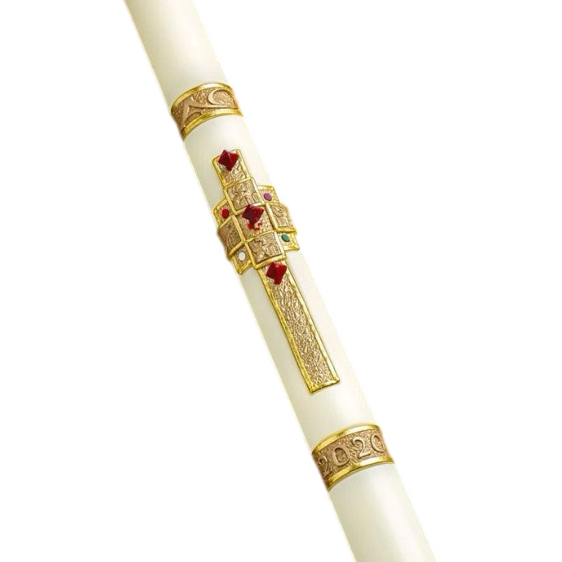 The EXIMIOUS, EVANGELIUM – In tribute to the writers of the four canonical Gospels. Matthew, Mark, Luke and John. The Evangelium represents these Evangelists in a beautiful iconic design rendered in bronze toned wax, gilded with 24 carat gold leaf, dramatically offsets the natural hues of the 51% Beeswax Paschal. This magnificent Paschal Candle will be at the perfect compliment to your Easter Season as well as other Liturgical Celebrations throughout the year.