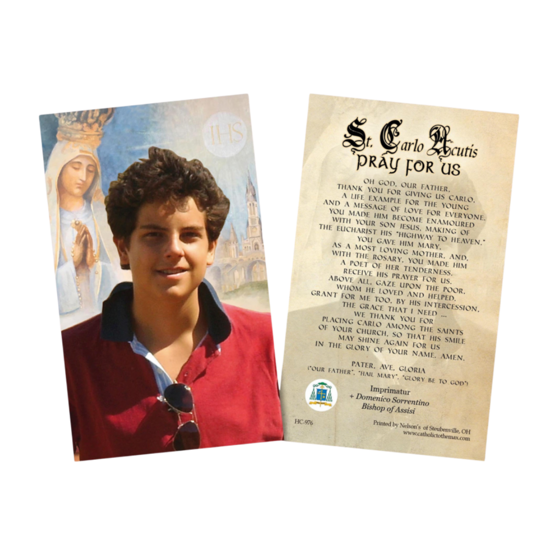 This 2.5" x 4.25" holy card features an image of Saint Carlo Acutis, and a prayer for his canonization.