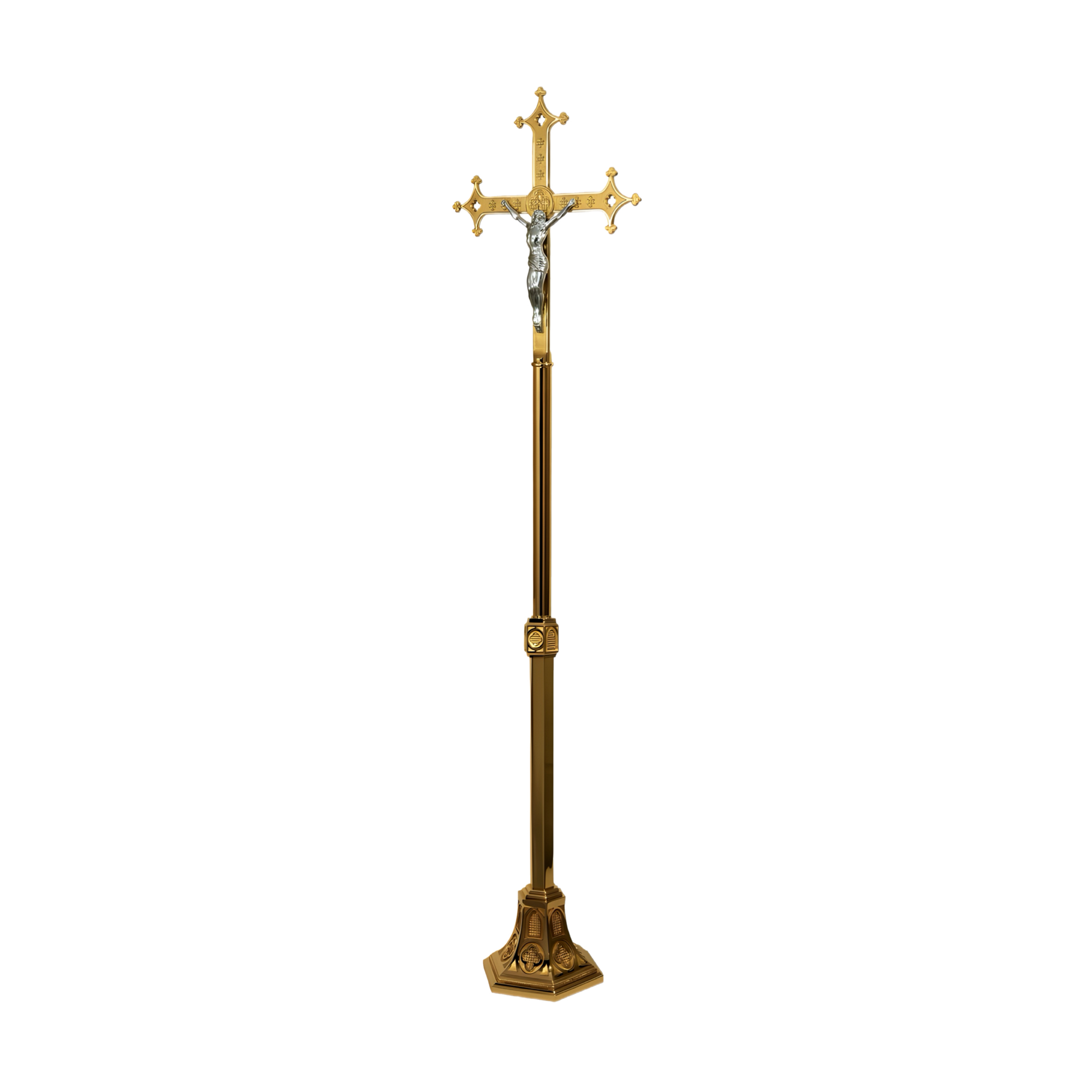 This 62PC25 Processional Cross & Stand are made in a High Polished Bronze. The Corpus is made of a High Polish Cast Aluminum. This Processional Cross & Stand is a part of the 6225 Series of Sanctuary Appointments. The 6225 Series consists of Matching Appointments all designed to complement any Sanctuary.
