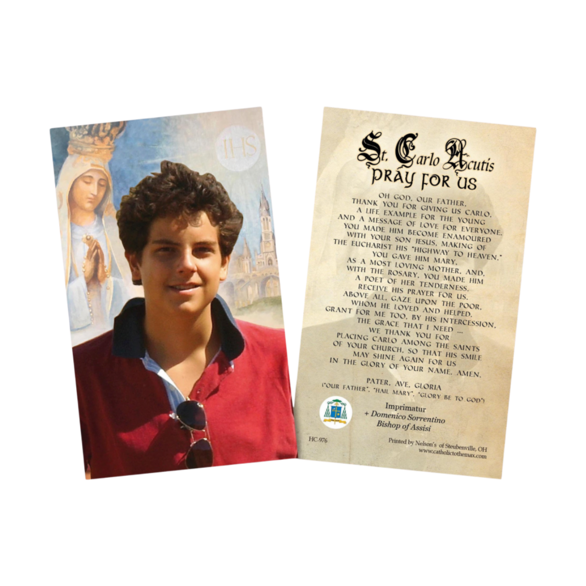 This 2.5" x 4.25" holy card features an image of Saint Carlo Acutis, and a prayer for his canonization.