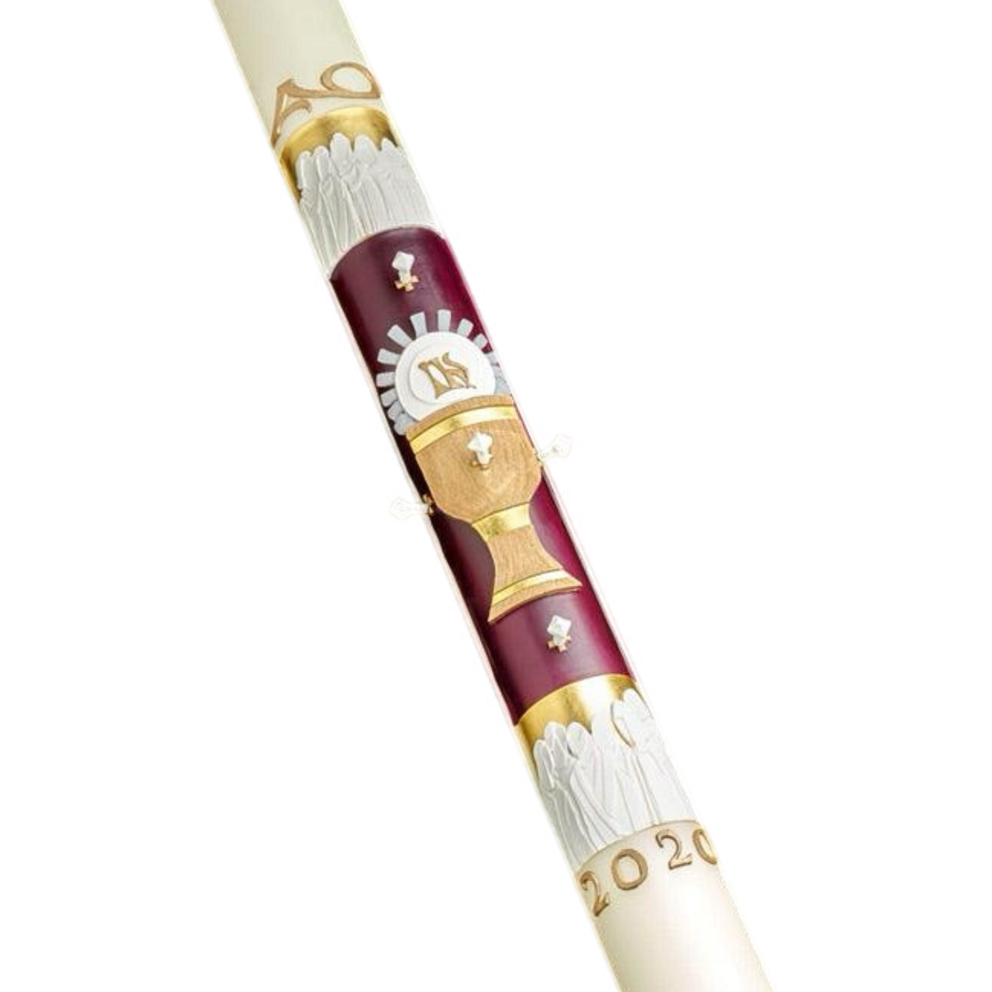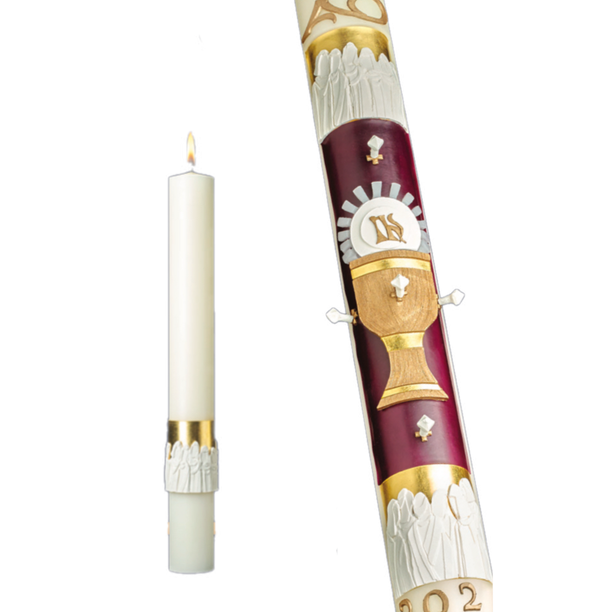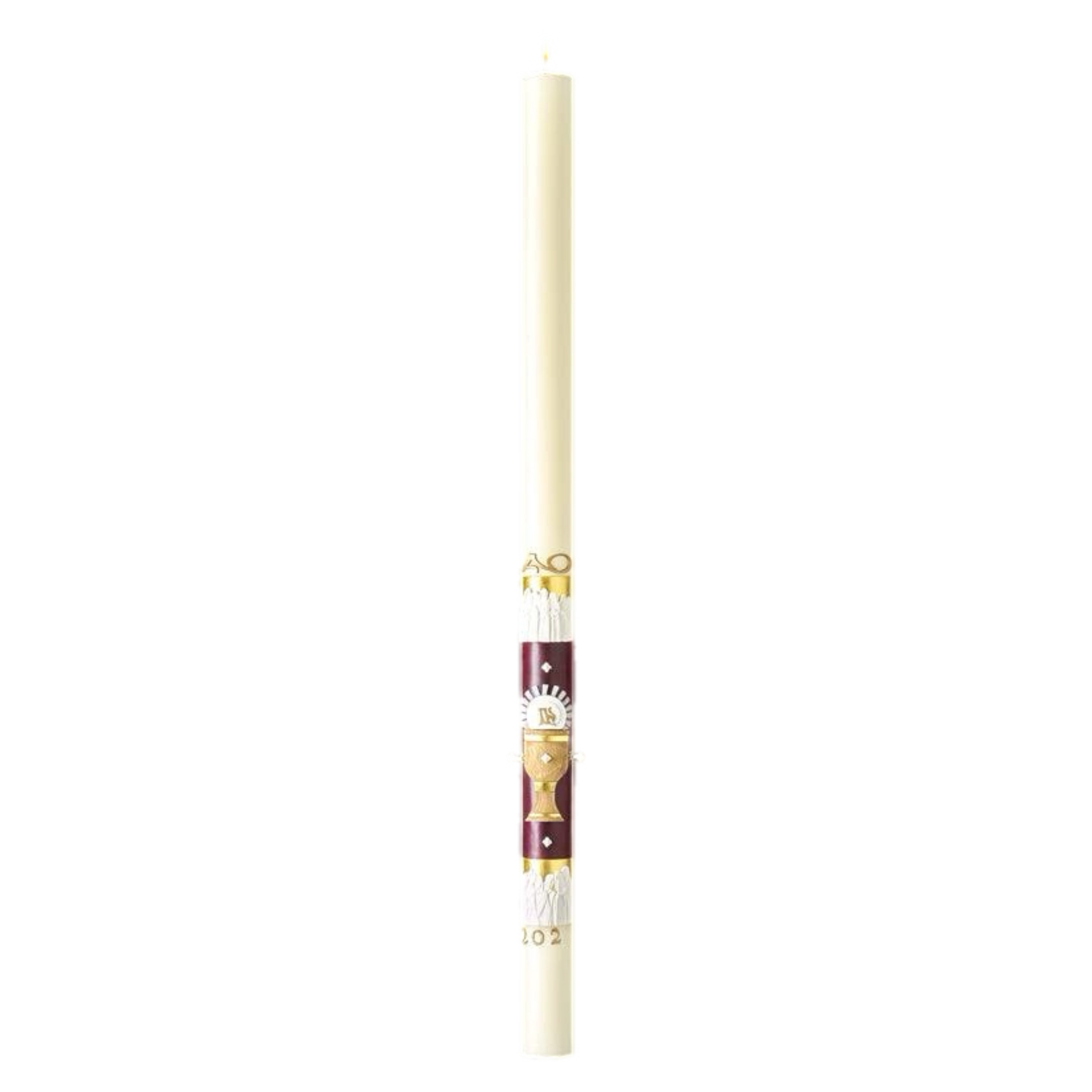 This 51% Beeswax EXIMIOUS Paschal Candle is a masterpiece of Ecclesiastical Design and skilled Artistic Craftsmanship. The TWELVE APOSTLES, is a dramatic expression of spiritual adoration, gloriously presented with rich gold, royal velvet, red and pure white hand-made wax symbols of the season. The design honors the Holy Eucharist, instituted by Jesus on the eve of His passion at the Last Supper, and it recognizes the 12 Apostles as witnesses and scribes to the passion, death, Resurrection and Ascension of our Lord.