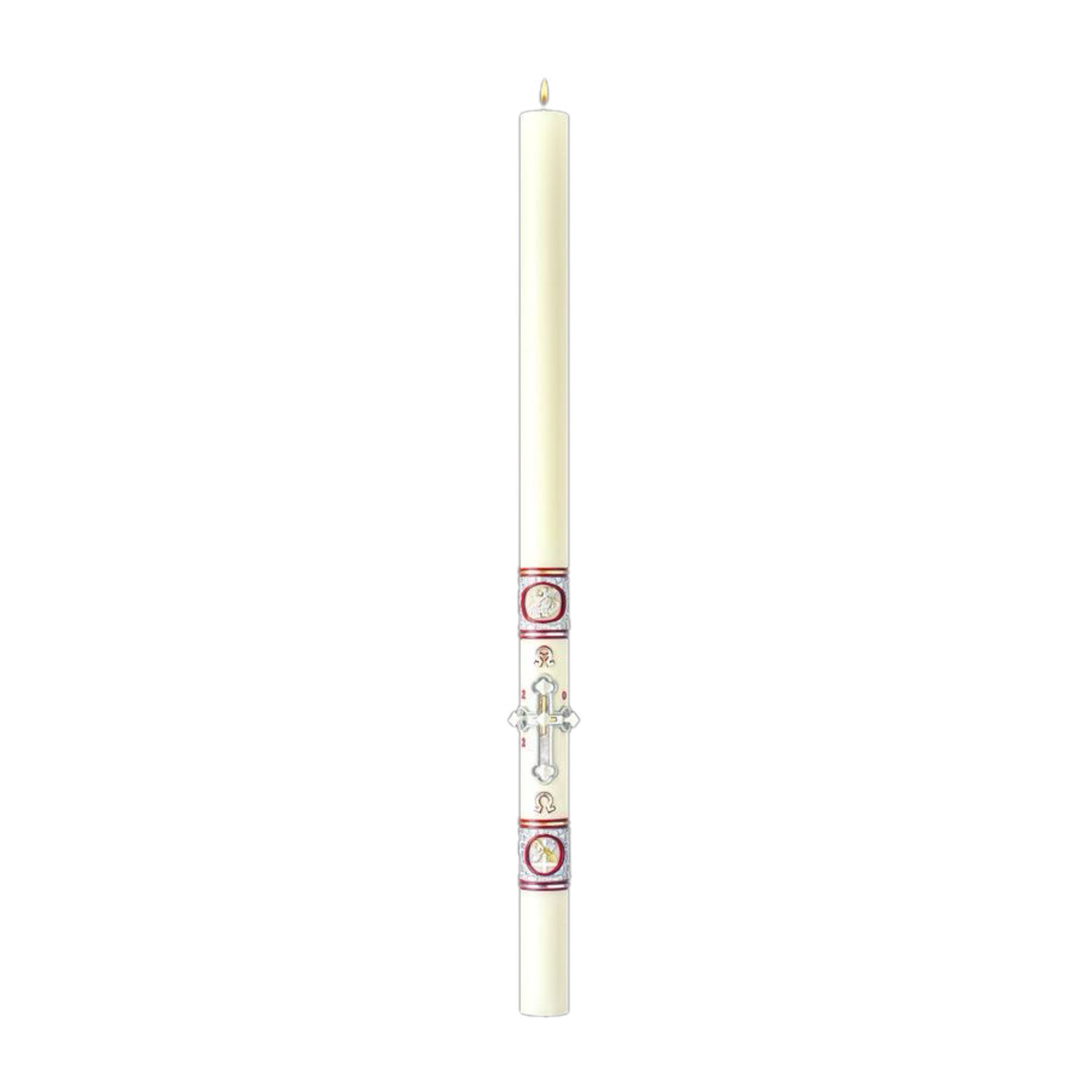 The EXIMIOUS, UPON THIS ROCK paschal features the rich symbolism of St. Peter. This paschal candle is adorned with the silver and gold keys to the Kingdom of Heaven entrusted to Peter by Christ. The inverted cross, which Peter requested to be crucified on, stating that he was not worthy of being crucified in the same manner in which Christ was.